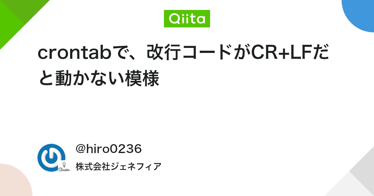 この記事について 先日現場で、掲題の原因によるトラブルが起こったので覚書として。 crontabで、行末の改行コードがCR+LFだと正常に動作しない模様。 無論、Linux環境で作業している限り改行コードはLFとなるはずで、このようなことは...